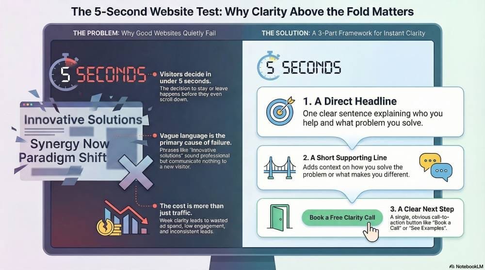 The uncomfortable truth is that visitors often decide whether to stay or leave before they even scroll. That decision happens fast, usually within five seconds.