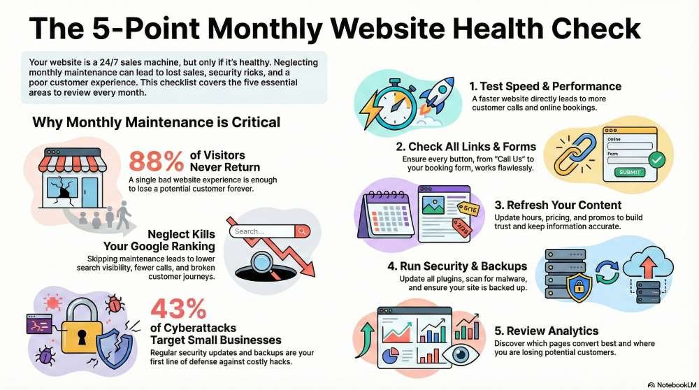 Small business websites should be checked once a month to prevent performance loss, security risks and customer drop-offs.